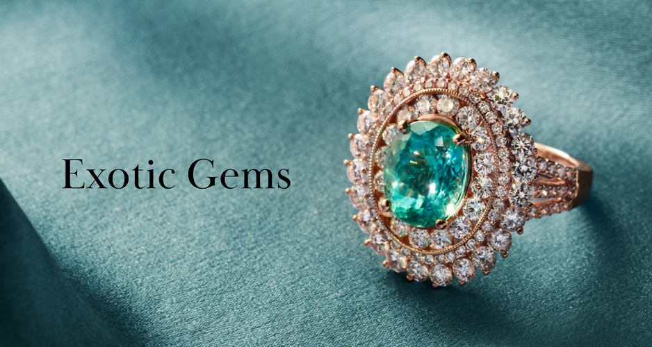 A gold ring with a large green gemstone surrounded by diamonds rests on a silky teal fabric. The text Exotic Gems appears on the left side.
