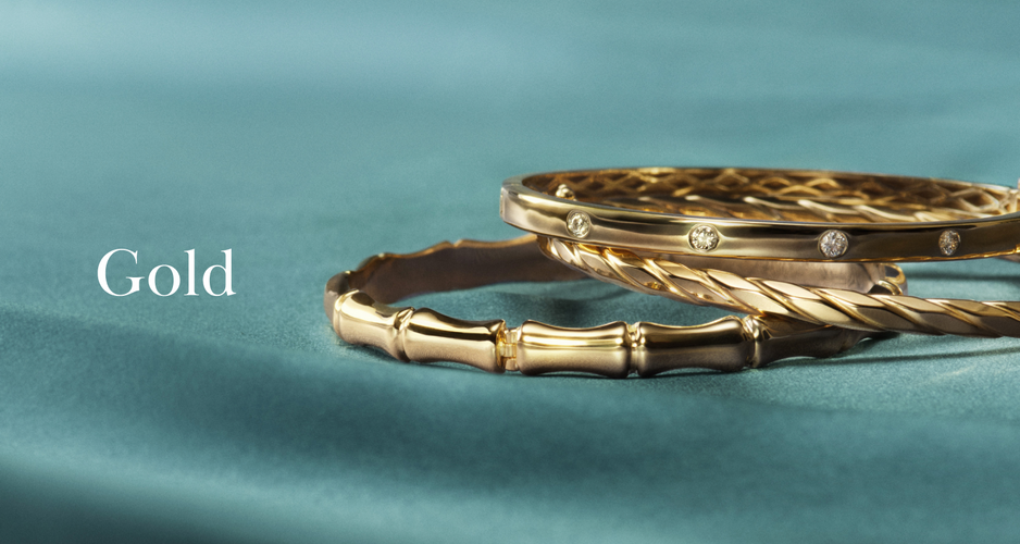 Three elegant gold bangles, one set with diamonds, rest on a soft teal fabric surface. The word Gold appears to the left in white text.