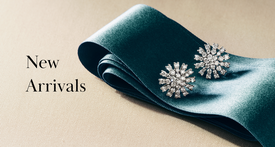 A person wearing gold rings and a bracelet touches their foot, with the words New Arrivals displayed on the left against a dark fabric background.