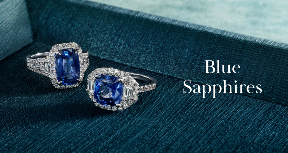 A diamond and blue sapphire bracelet stands upright on a reflective blue surface with the text Blue Sapphires beside it against a blurred blue background.