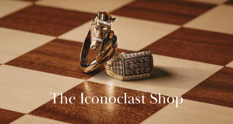 A gold horse-head bracelet and a gem-studded rectangular ring rest on a chessboard beside the text The Iconoclast Shop.